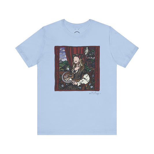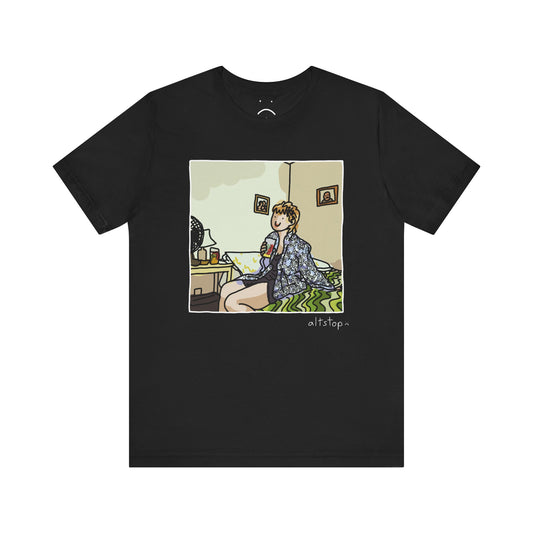 gorl with a cup on a bed deluxe tee